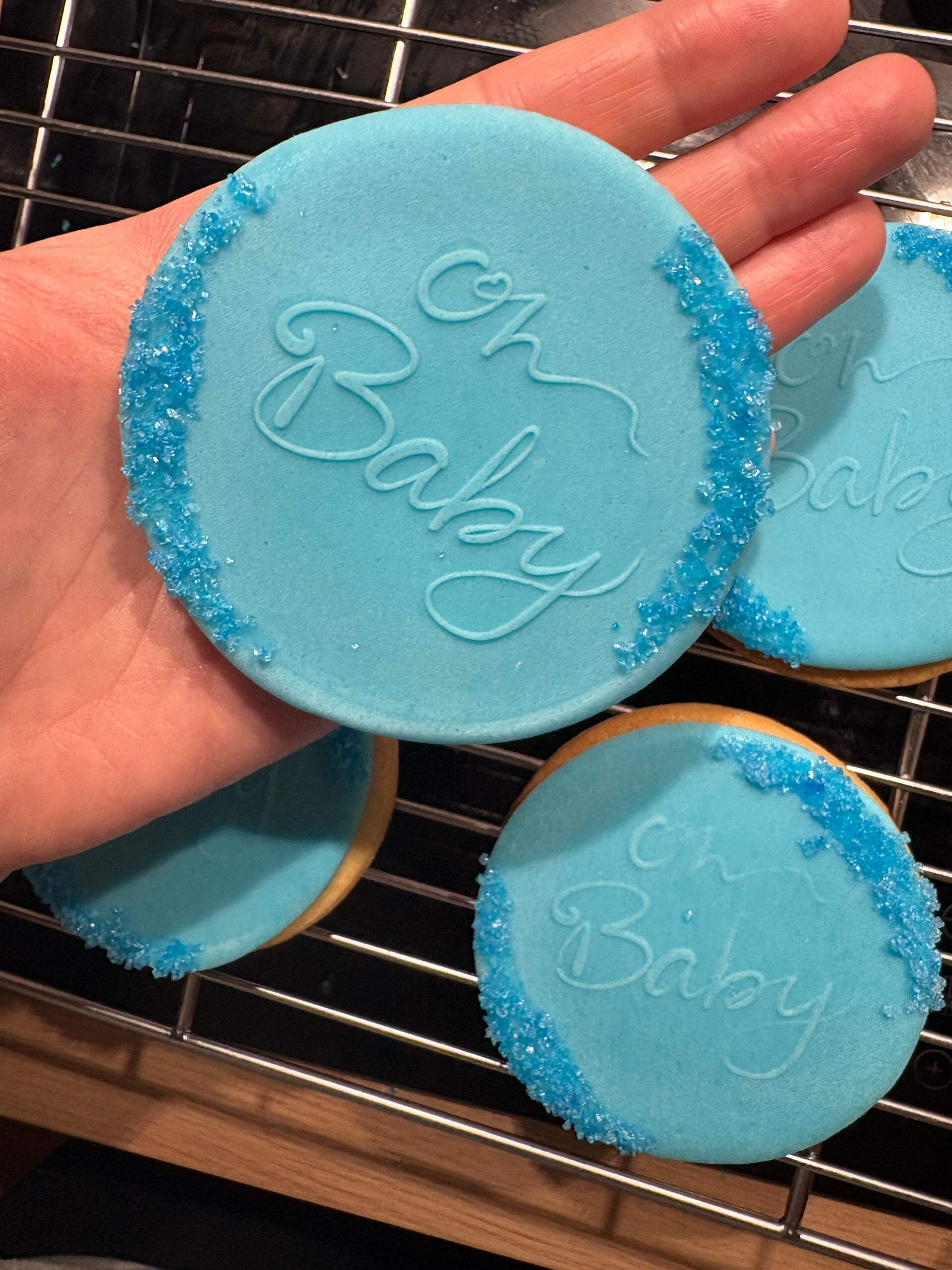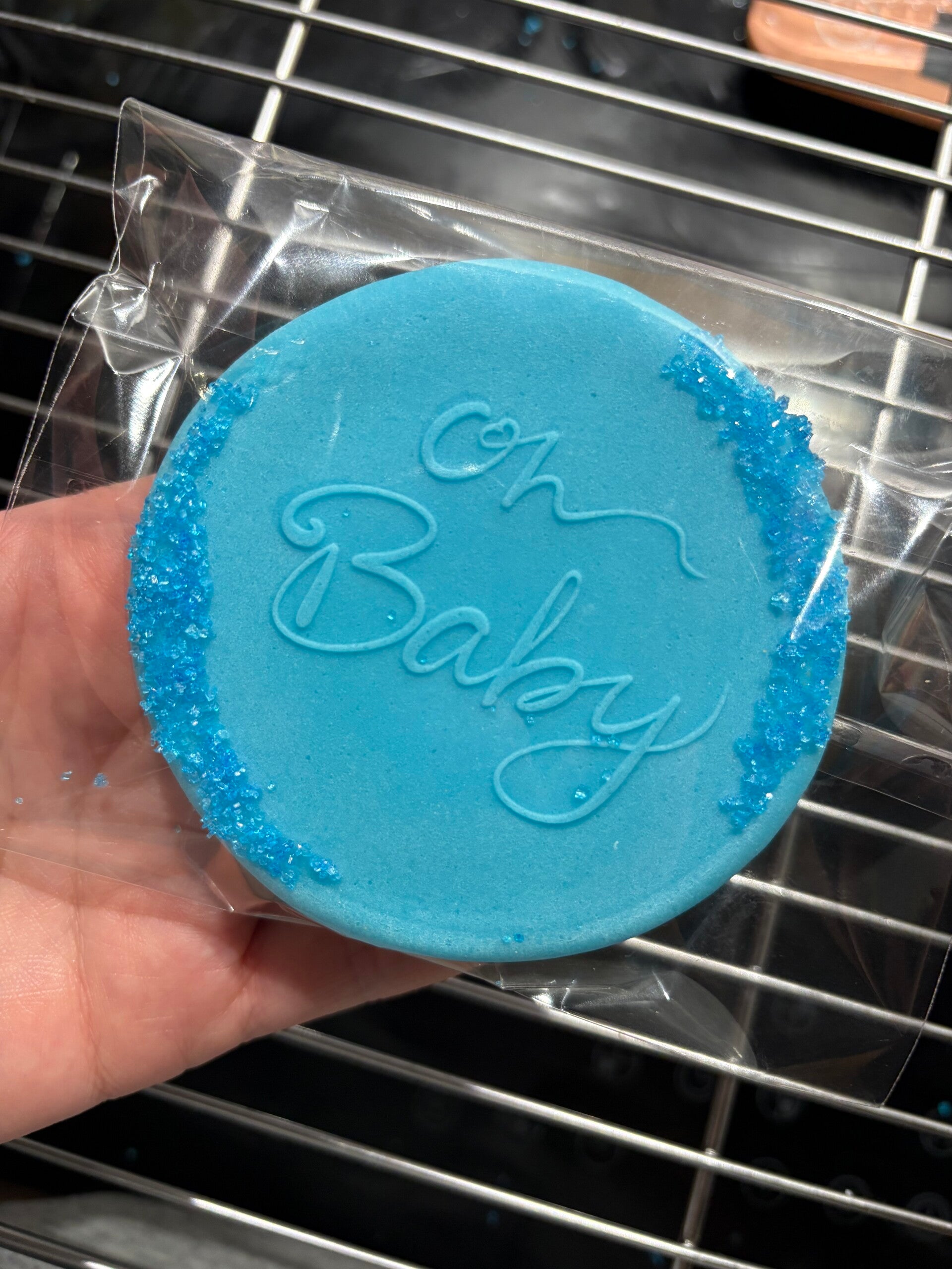 Handgemaakte “Oh Baby”-koekjes perfect voor babyshowers, gender reveals of als lief cadeautje.